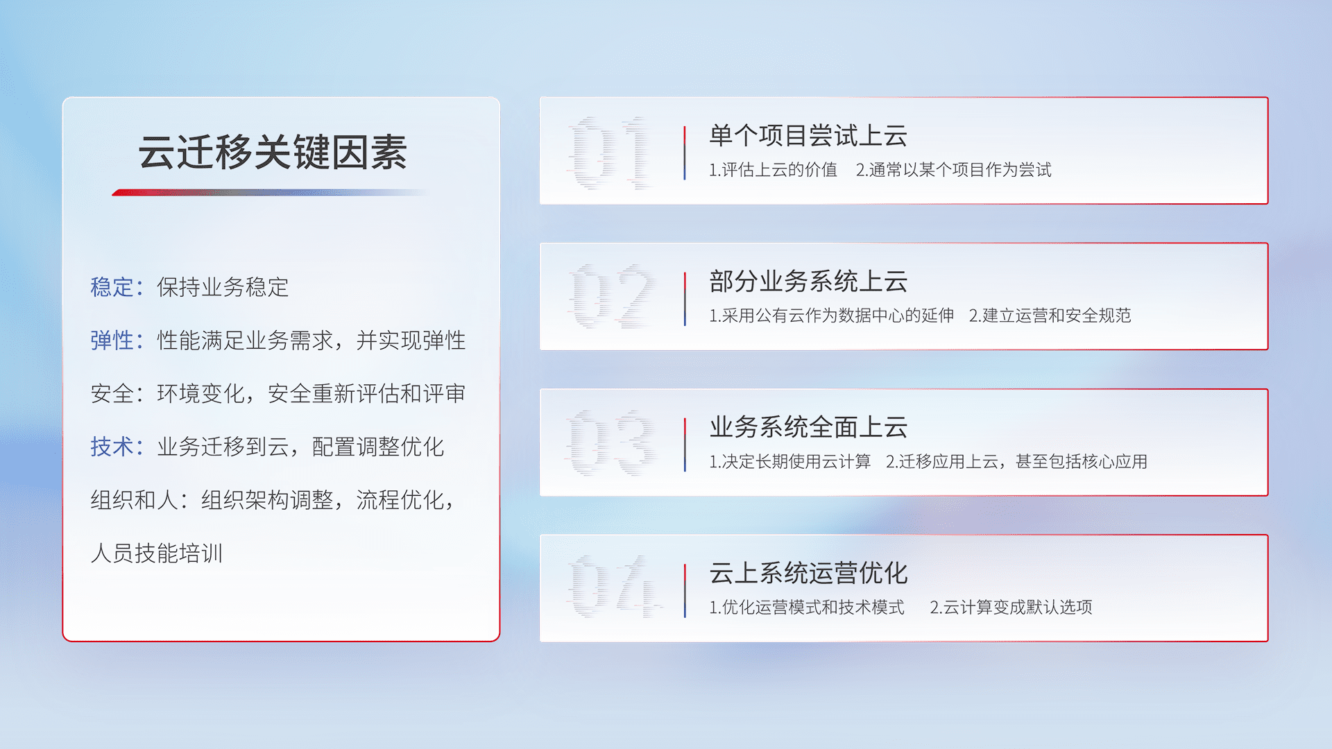 结合实际业务,,从规划设计、、、、云平台选型、、、、云原生改造、、、、数据迁移、、、、集成交付,,,,迁移全过程为客户识别最佳上云路径,,,做好风险识别管理,,,,设计网络架构、、、、身份权限、、、安全审计合规、、操作审计、、、、日志审计、、监控告警策略、、多站点容灾设计等,,,,对云上基础设施进行整体规划,,提升IT治理水平,,,,以满足弹性、、、高可用、、高性能的需求。。