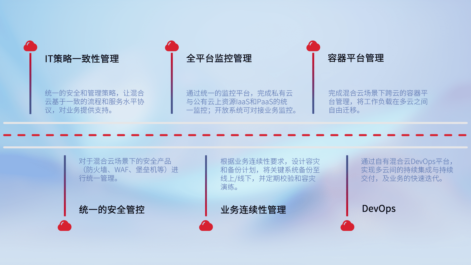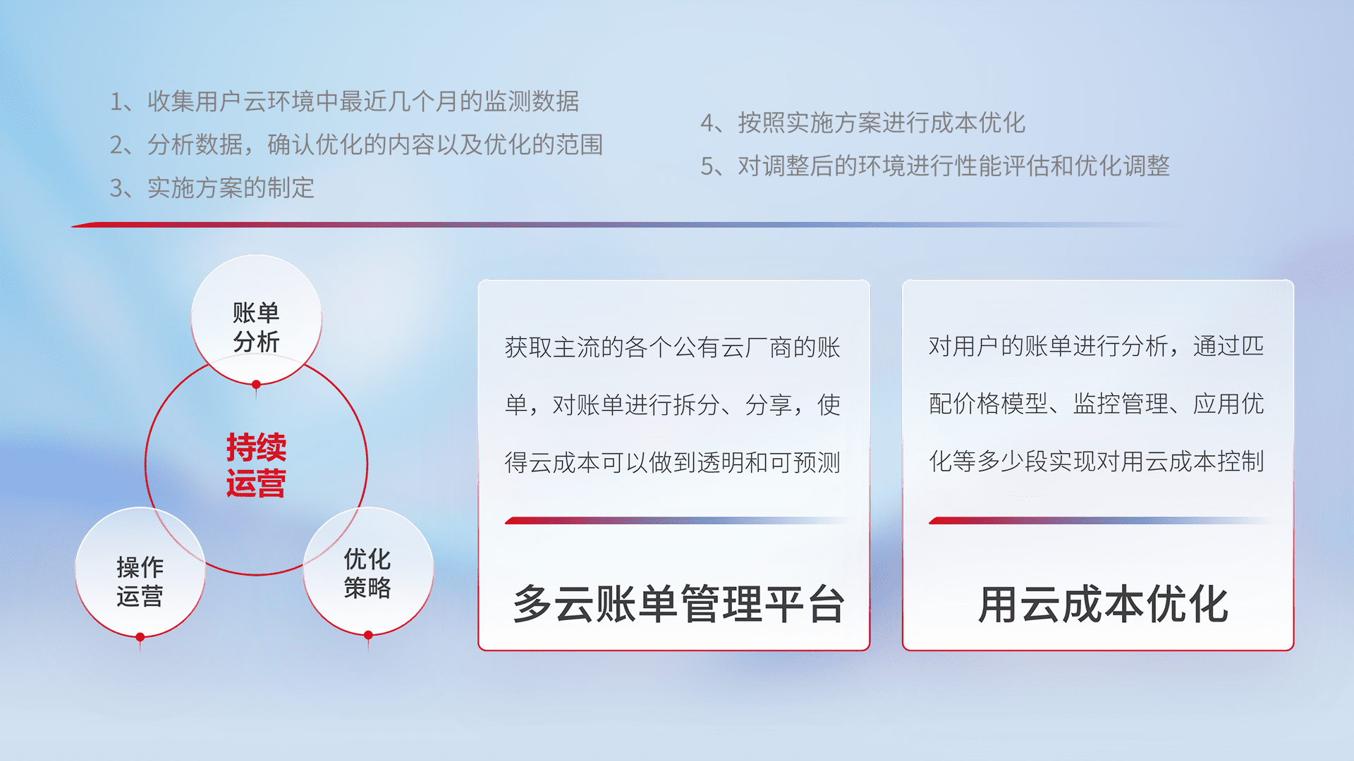 通过多云纳管,,以统一的资源数据模型把客户的云资源进行抽象和封装,,,,进而实现对多云资源的统一操作,,,保障云资源管理的可靠性、、、、稳定性与可用性。。。量身定制化运维内容,,,配置、、、开发运维、、补丁管理、、、备份、、、、监控、、、认证和访问管理、、、、审计和日常巡检等,,保障在用云过程中的可靠度,,,稳定度以及高可用率。。。。