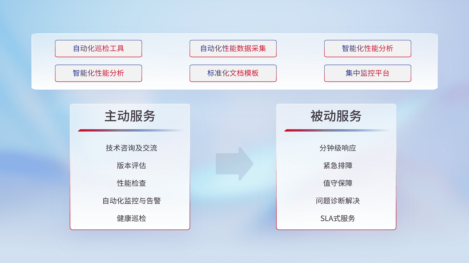 智能化工具和标准化文档,,,保障服务质量,,提供主动服务(包含技术咨询、、版本评估、、性能检查、、、、自动化监控与告警、、健康巡检)和被动服务包含(分钟级响应、、紧急排障、、、、值守保障、、问题诊断解决、、、SLA服务)。。。